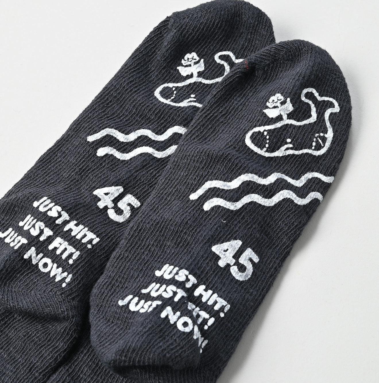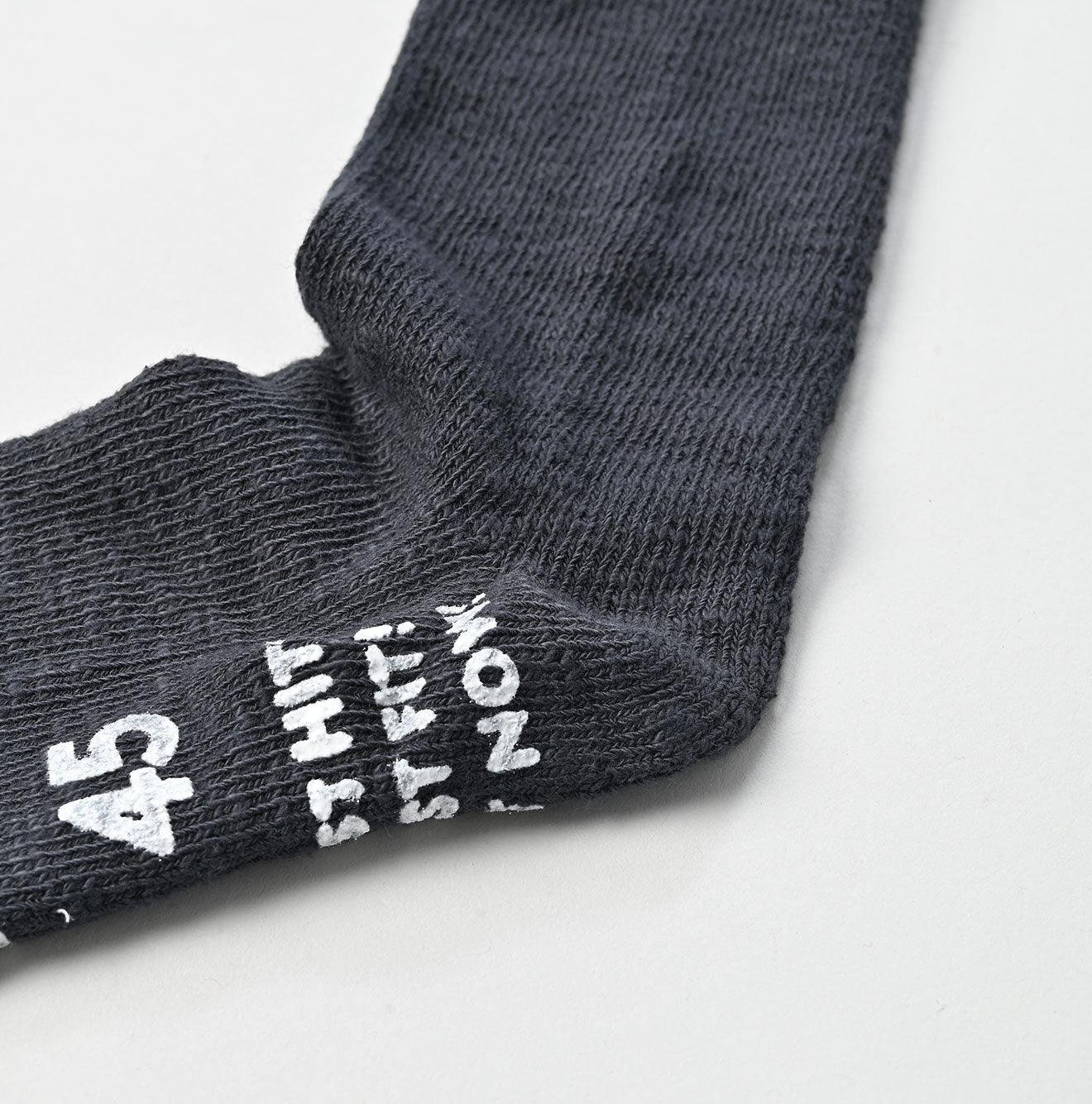 These socks are crafted from slub cotton with natural thickness variations. tightly knit for durability. enhanced by nylon and polyurethane for added resilience. With excellent stretch recovery. they fit snugly and gently wrap around your feet. On the sole. our beloved Socks Whale. Poco-chan. swims alongside a JUST FIT! grip for extra comfort and stability—perfect for a secure fit.