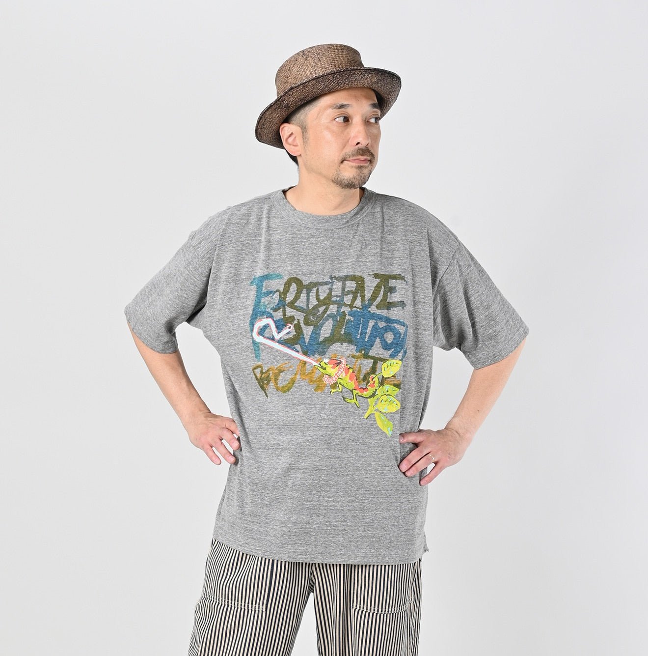 A boldly painted chameleon. rendered with brushstrokes reminiscent of an oil painting. stands out with vivid detail. The logo and artwork are printed using different techniques to highlight their textures. The silhouette is based on the aloha shirt—generously wide in the body with a slightly cropped length. offering a relaxed and playful fit.