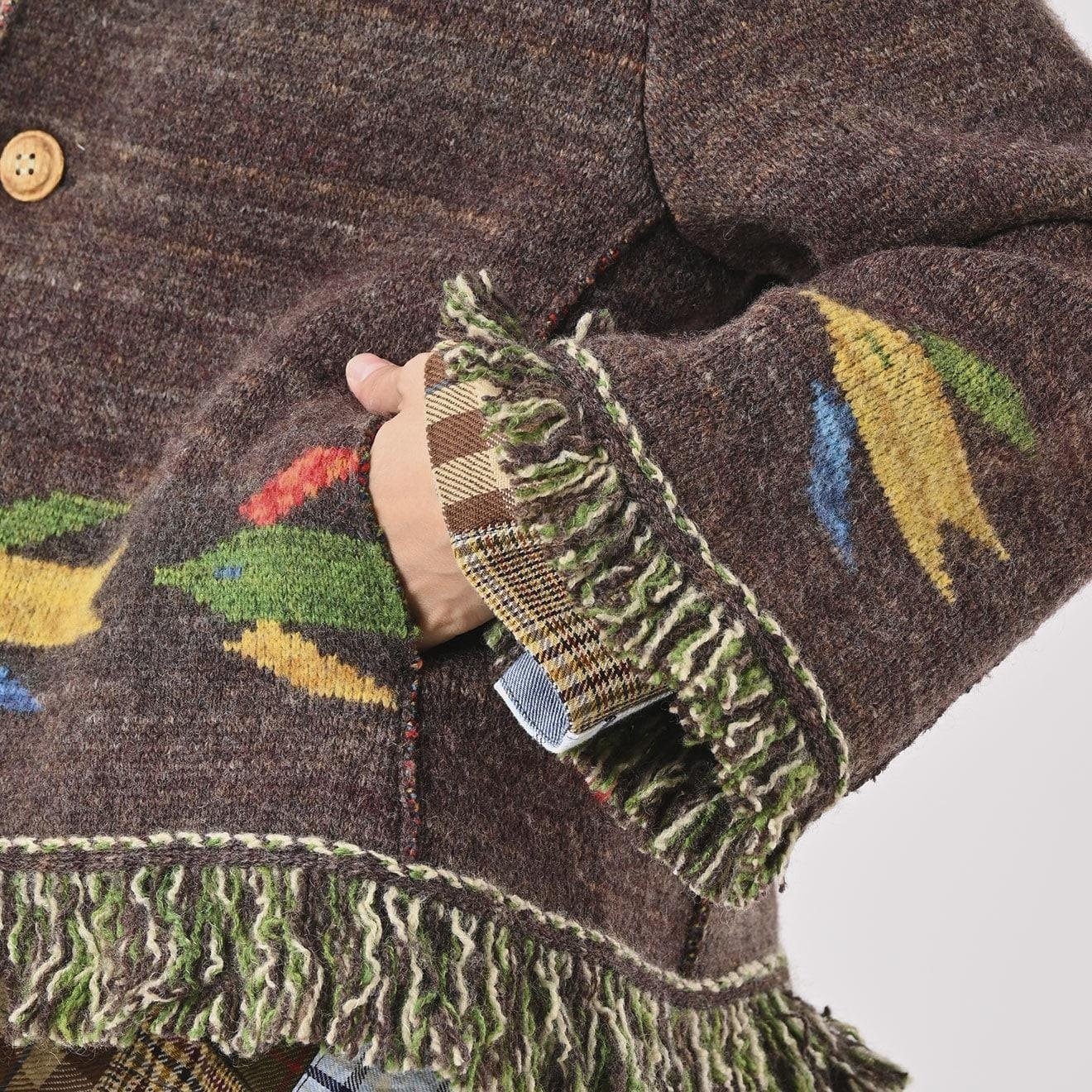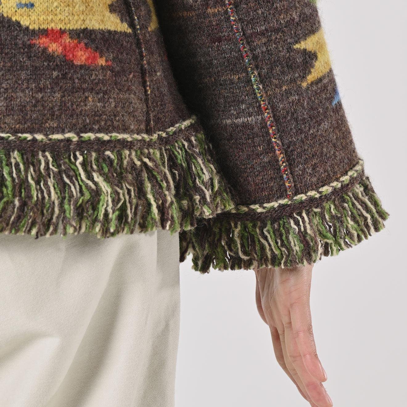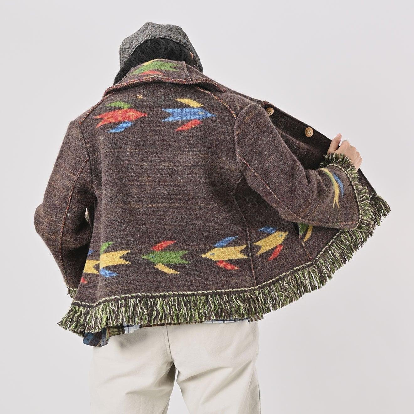 This shawl-collar bolero features an artistic depiction of a free-spirited bird. brought to life through intricate knitting techniques. The fringe and line detailing at the hem add a touch of elegance and charm.