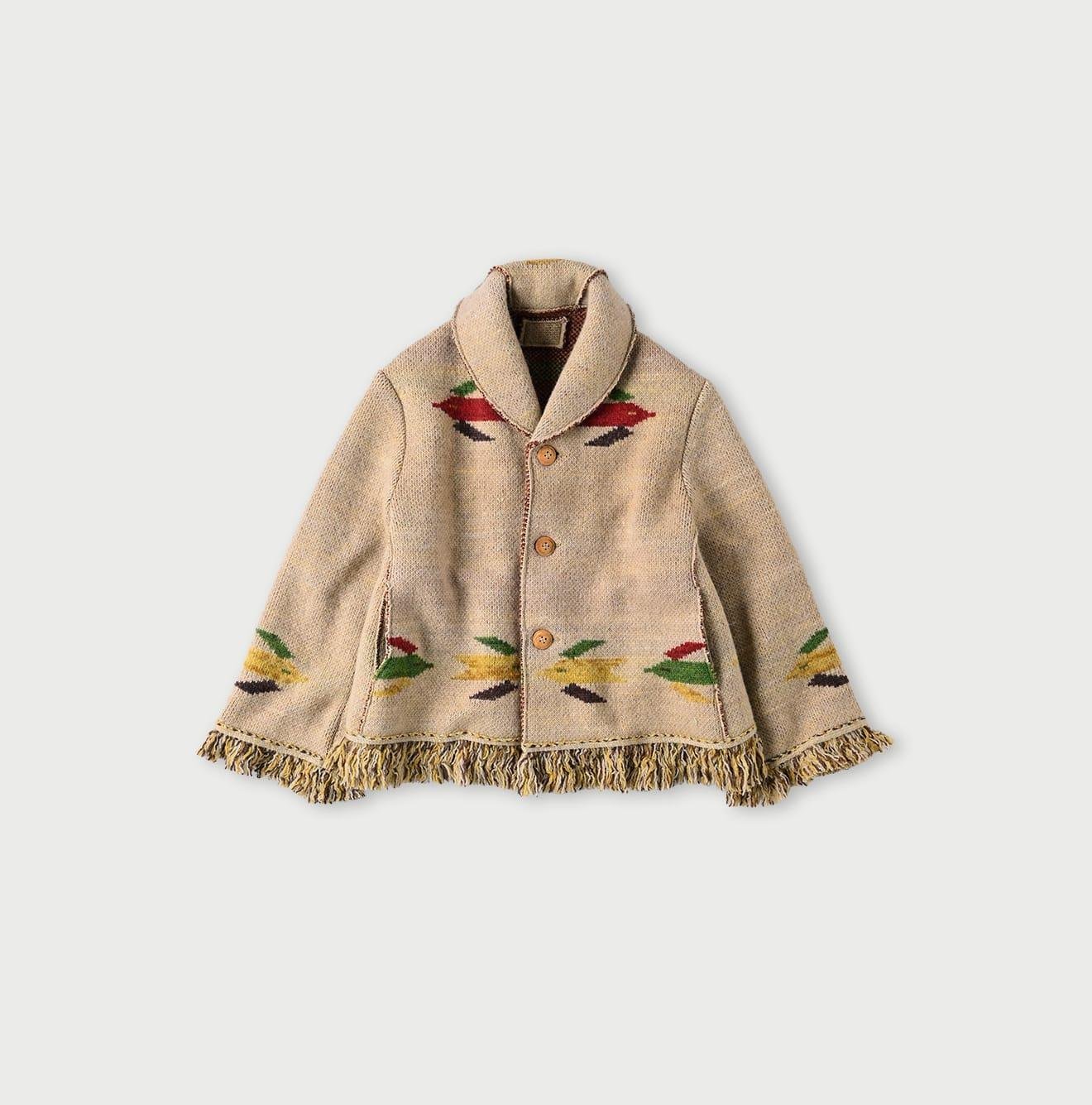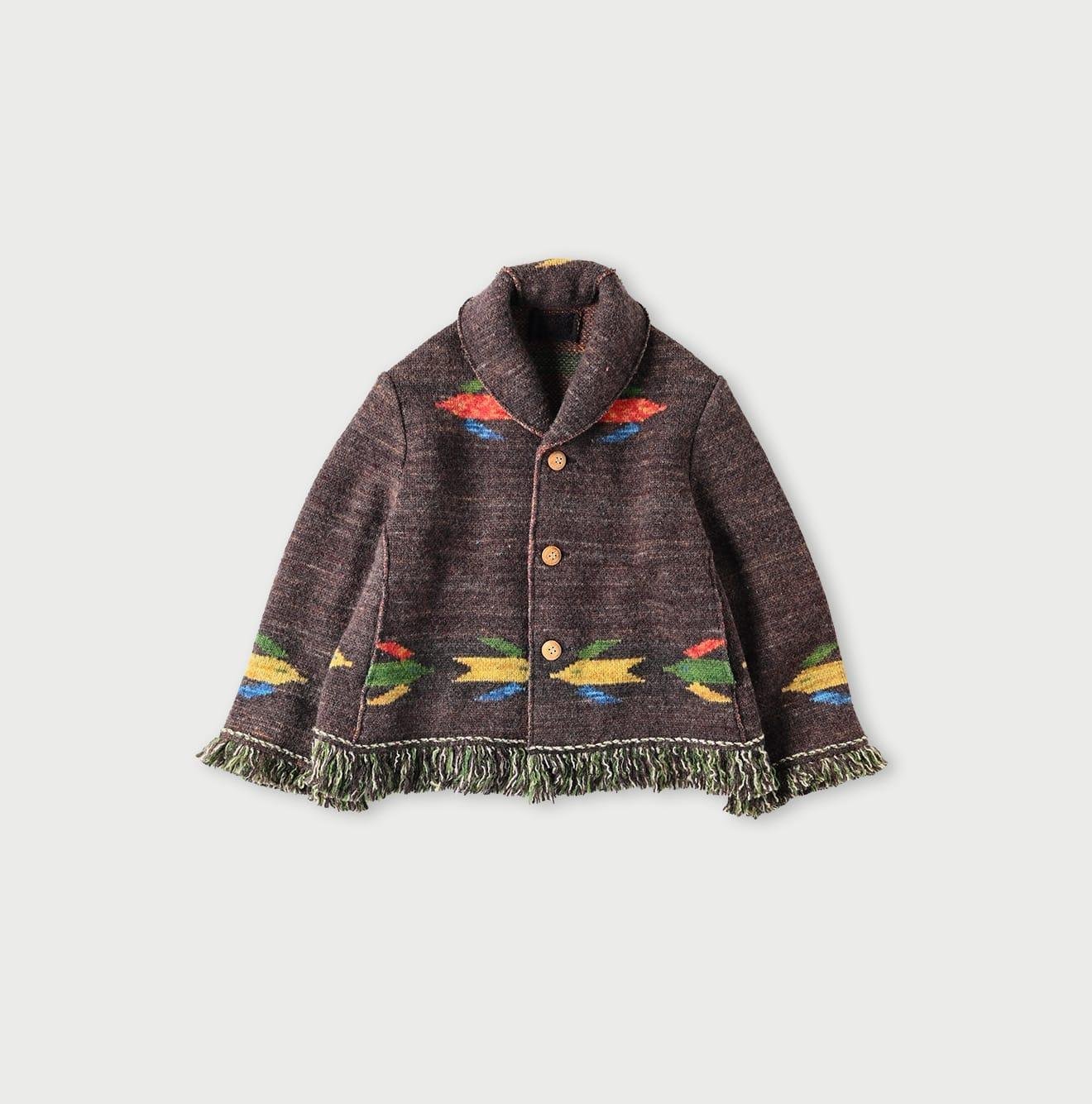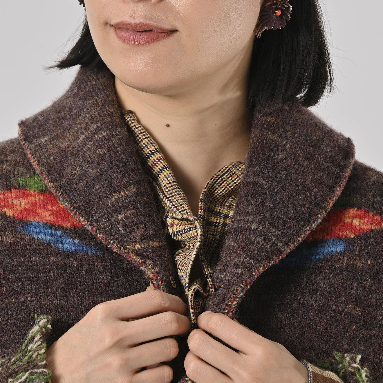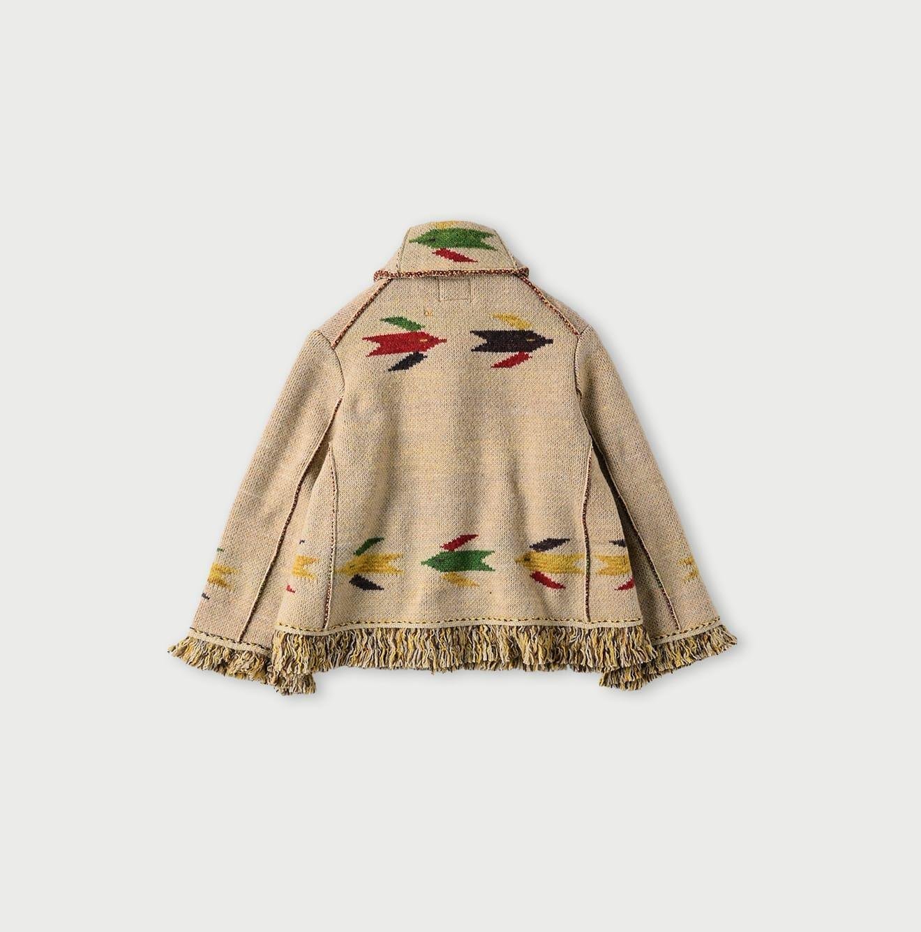 This shawl-collar bolero features an artistic depiction of a free-spirited bird. brought to life through intricate knitting techniques. The fringe and line detailing at the hem add a touch of elegance and charm.