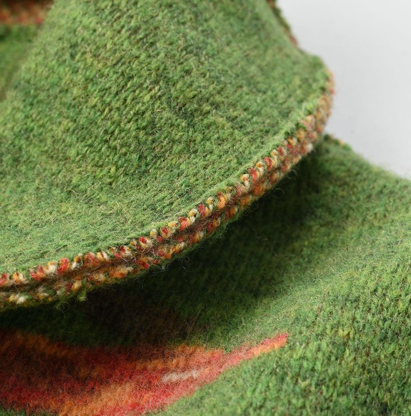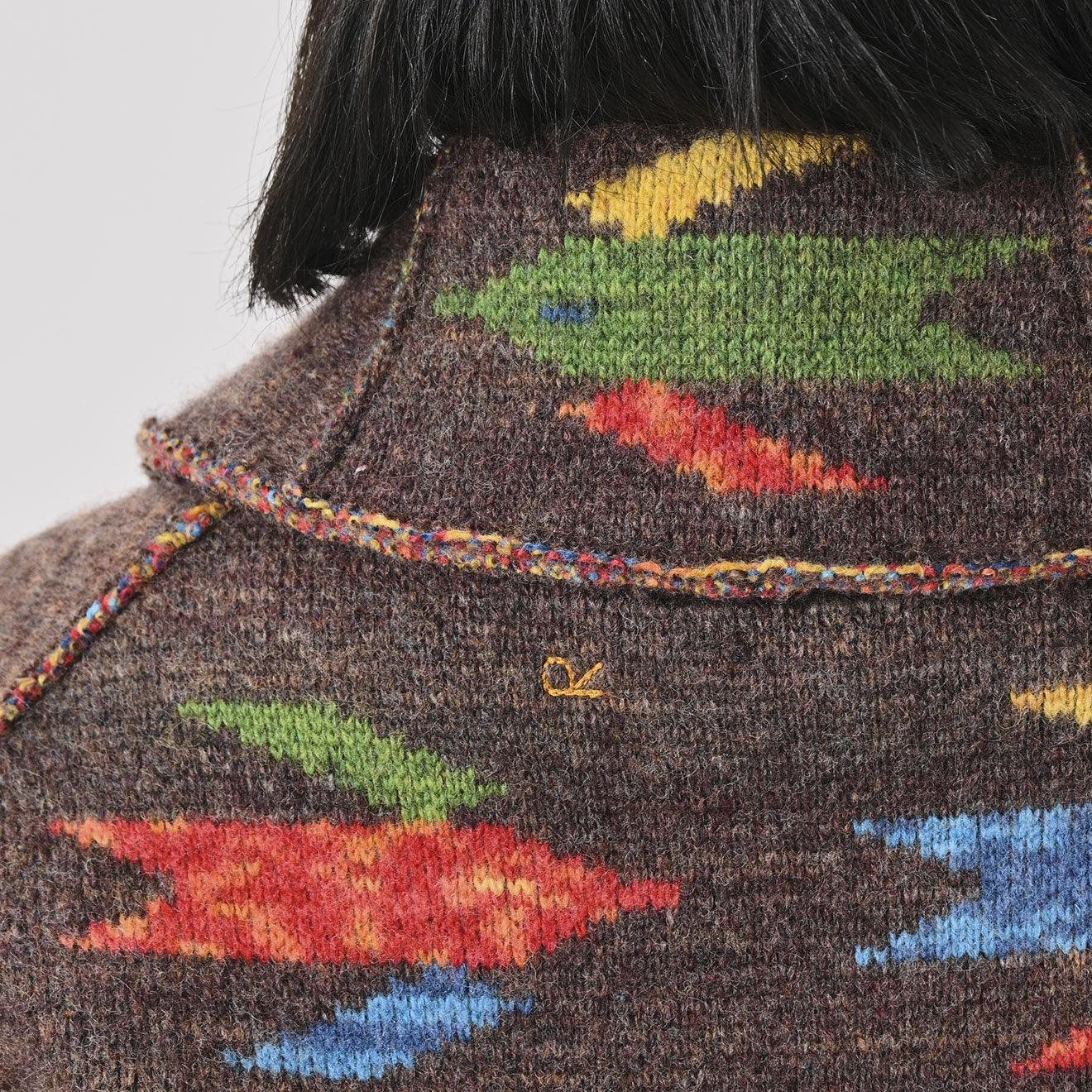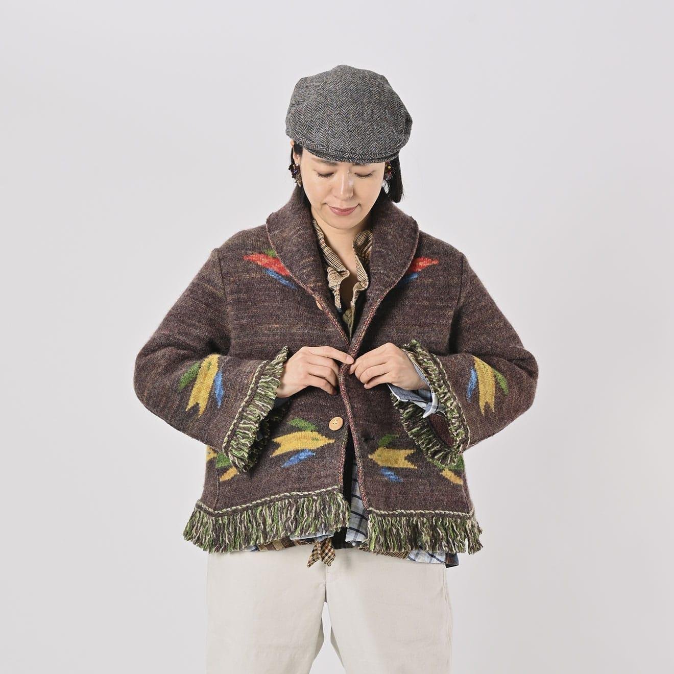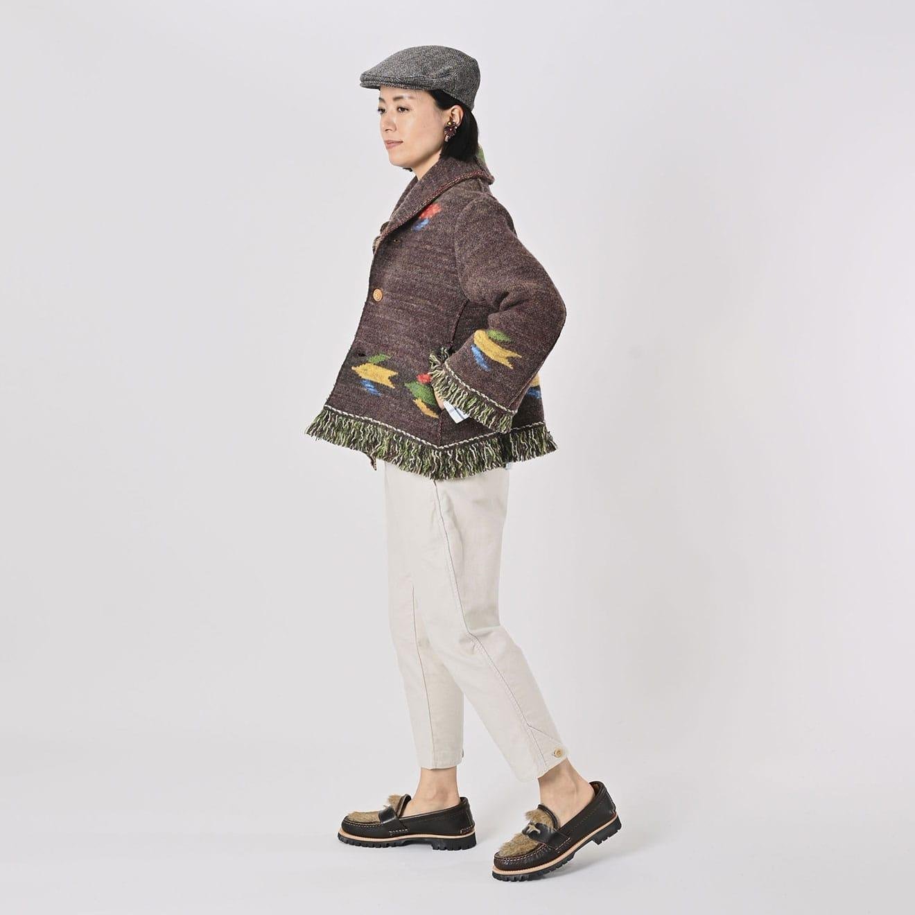 The wool. spun on traditional spinning wheels that clatter softly as they work. has a delightful uneven texture reminiscent of hand-spun yarn. The yarns are gathered together. much like a bundle of colorful candy sticks. and paired with kasuri-dyed threads to create a rich. heartwarming palette.
