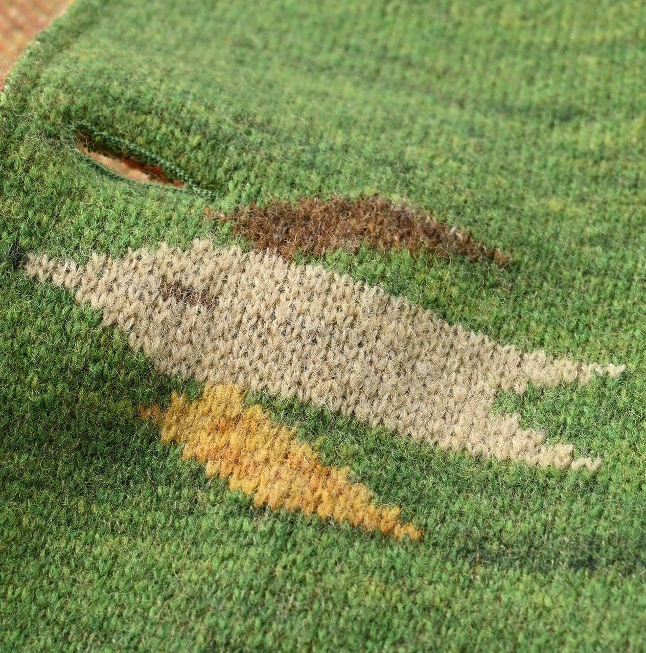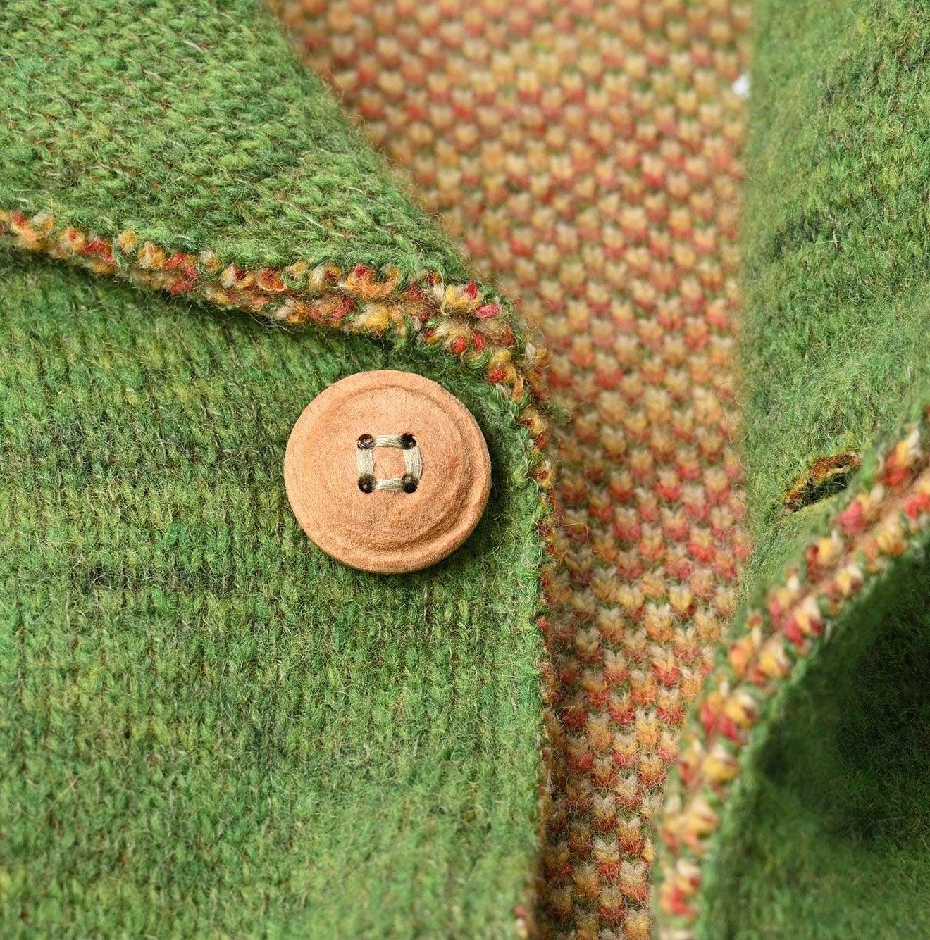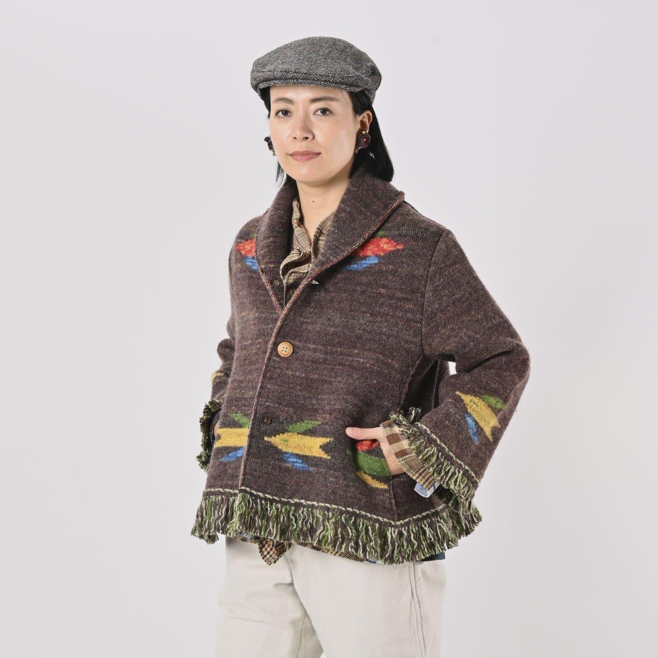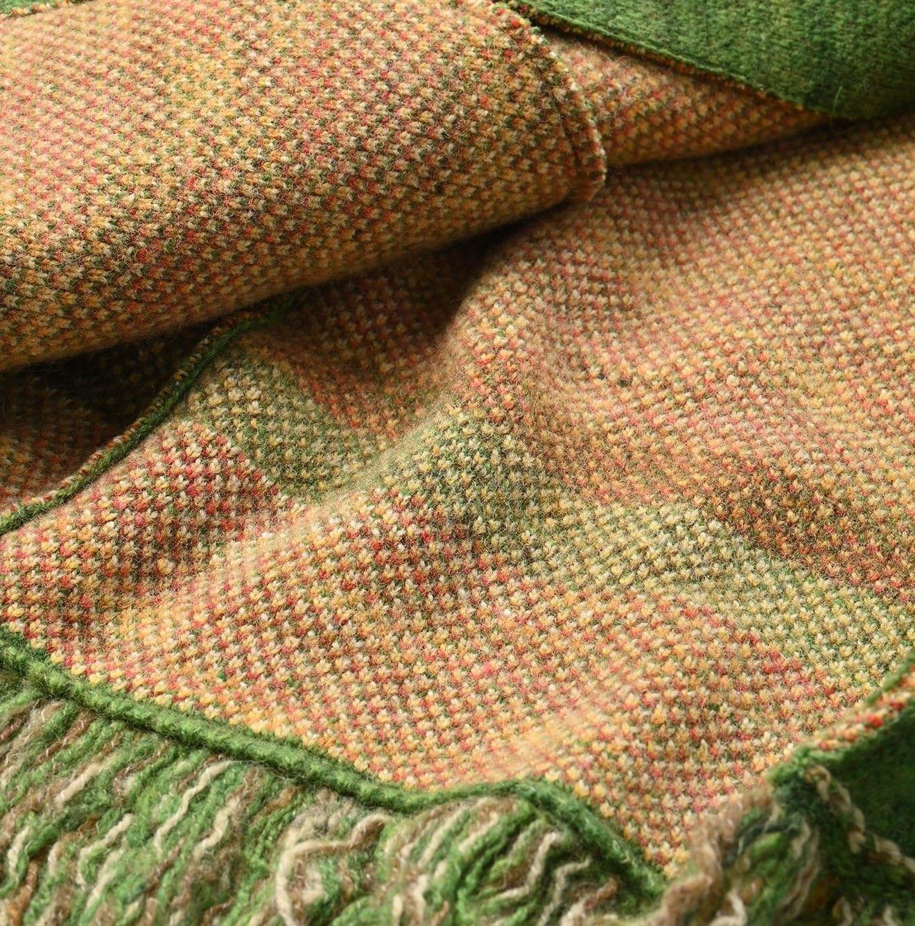 The wool. spun on traditional spinning wheels that clatter softly as they work. has a delightful uneven texture reminiscent of hand-spun yarn. The yarns are gathered together. much like a bundle of colorful candy sticks. and paired with kasuri-dyed threads to create a rich. heartwarming palette.
