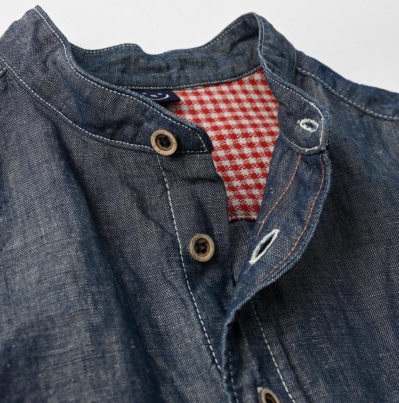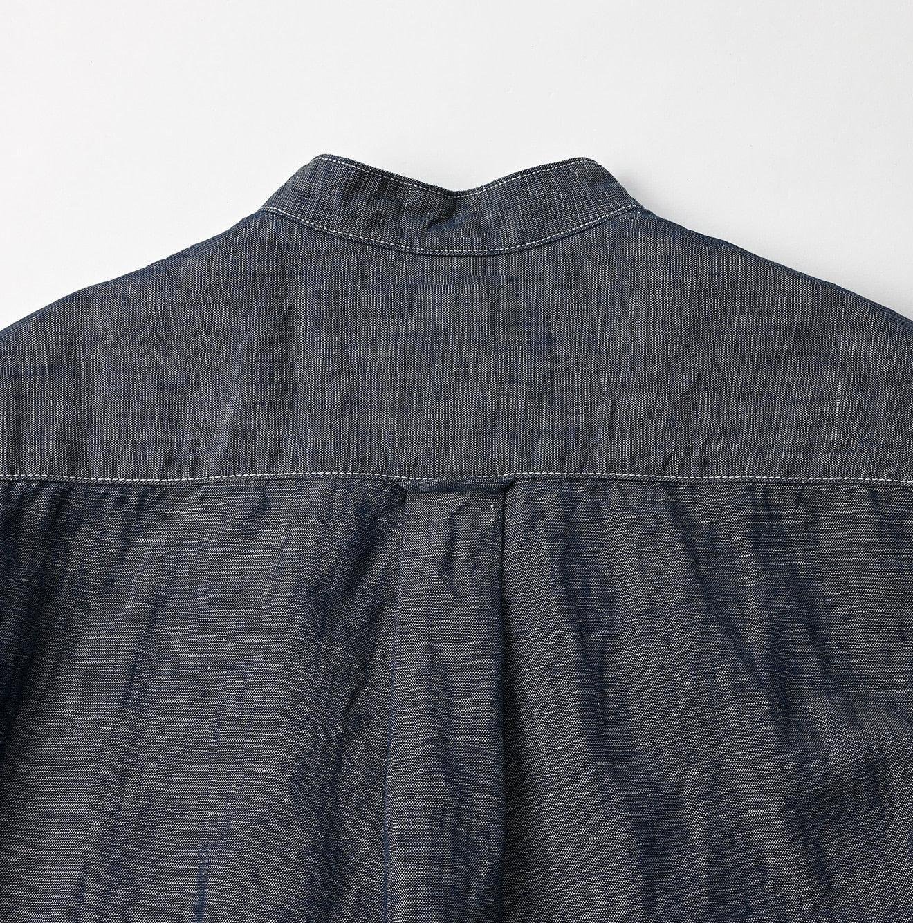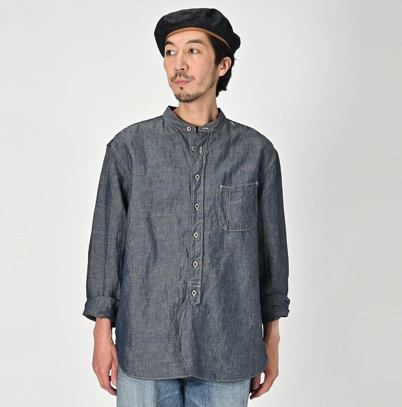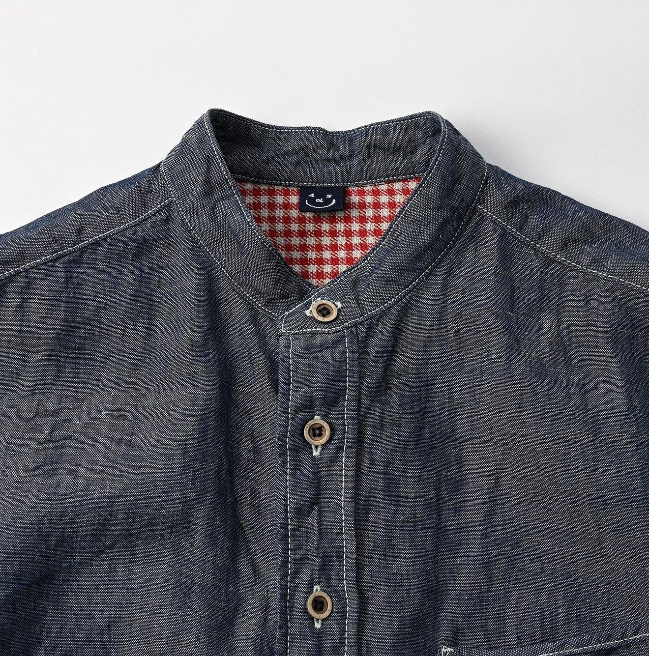 The Cotton Linen Dungaree 908 Loafer Stand Collar Shirt Nou by 45R takes inspiration from the style of American Ivy Leaguers of the 1960s. This loafer shirt features a sleek. slim silhouette with a rounded hem and a stand collar for a more casual finish.