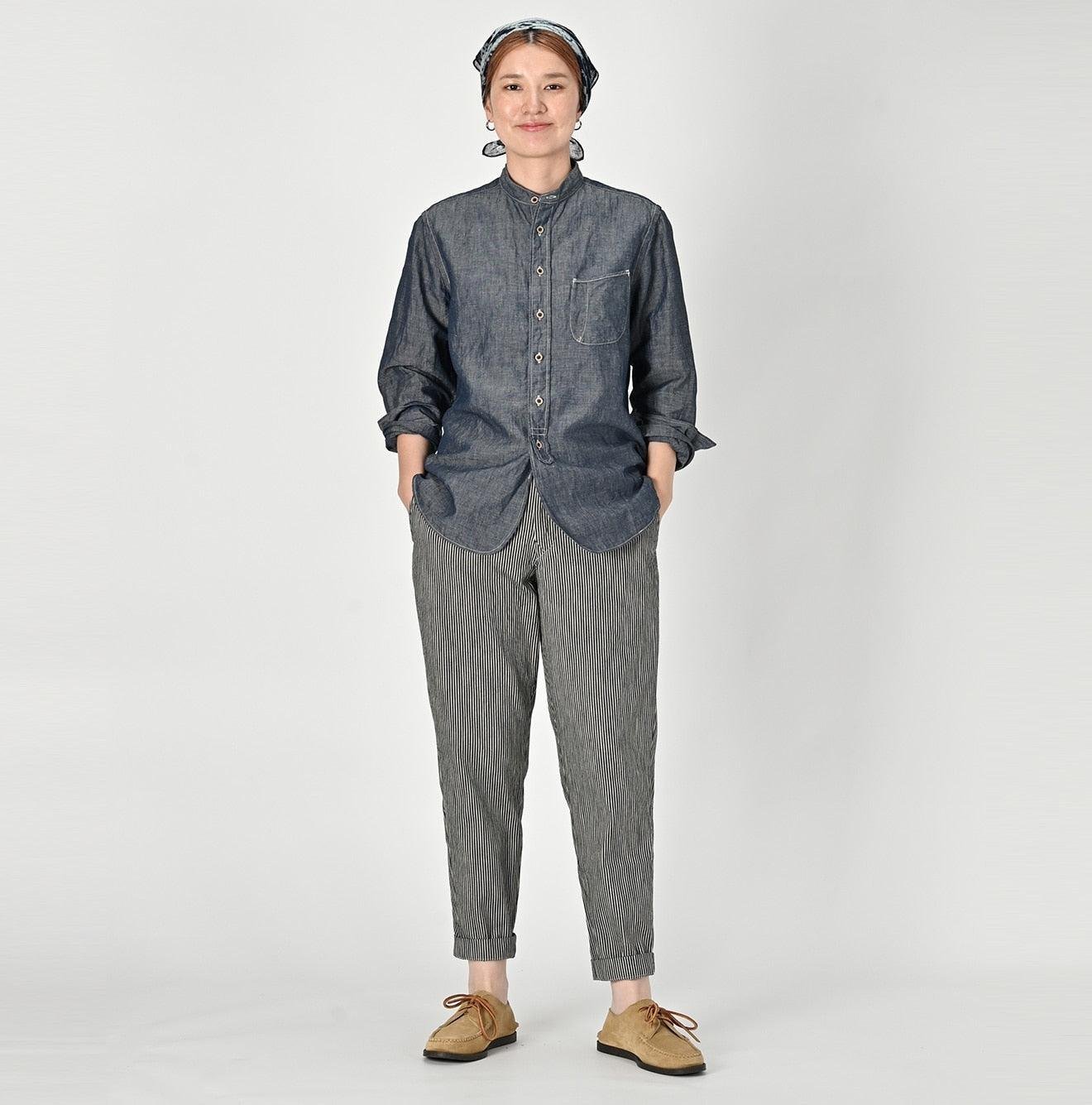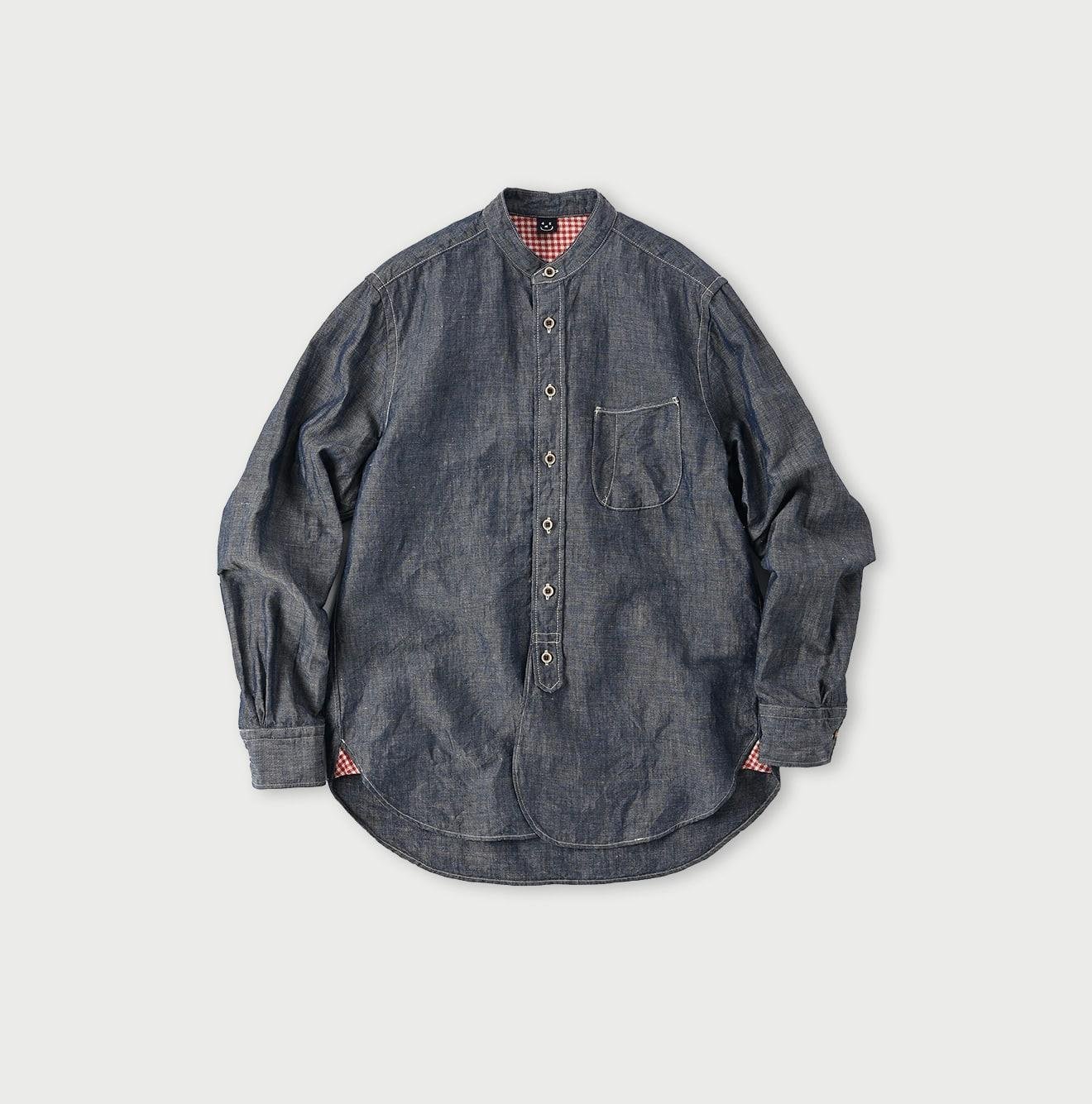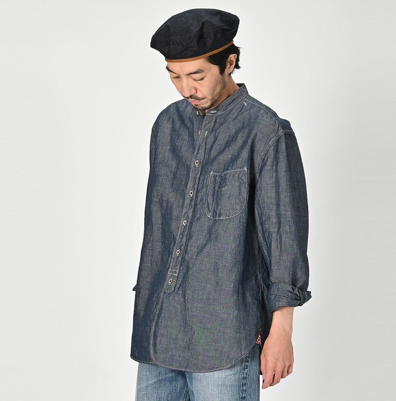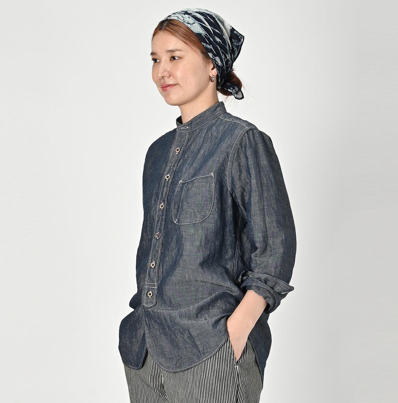 The Cotton Linen Dungaree 908 Loafer Stand Collar Shirt Nou by 45R takes inspiration from the style of American Ivy Leaguers of the 1960s. This loafer shirt features a sleek. slim silhouette with a rounded hem and a stand collar for a more casual finish.