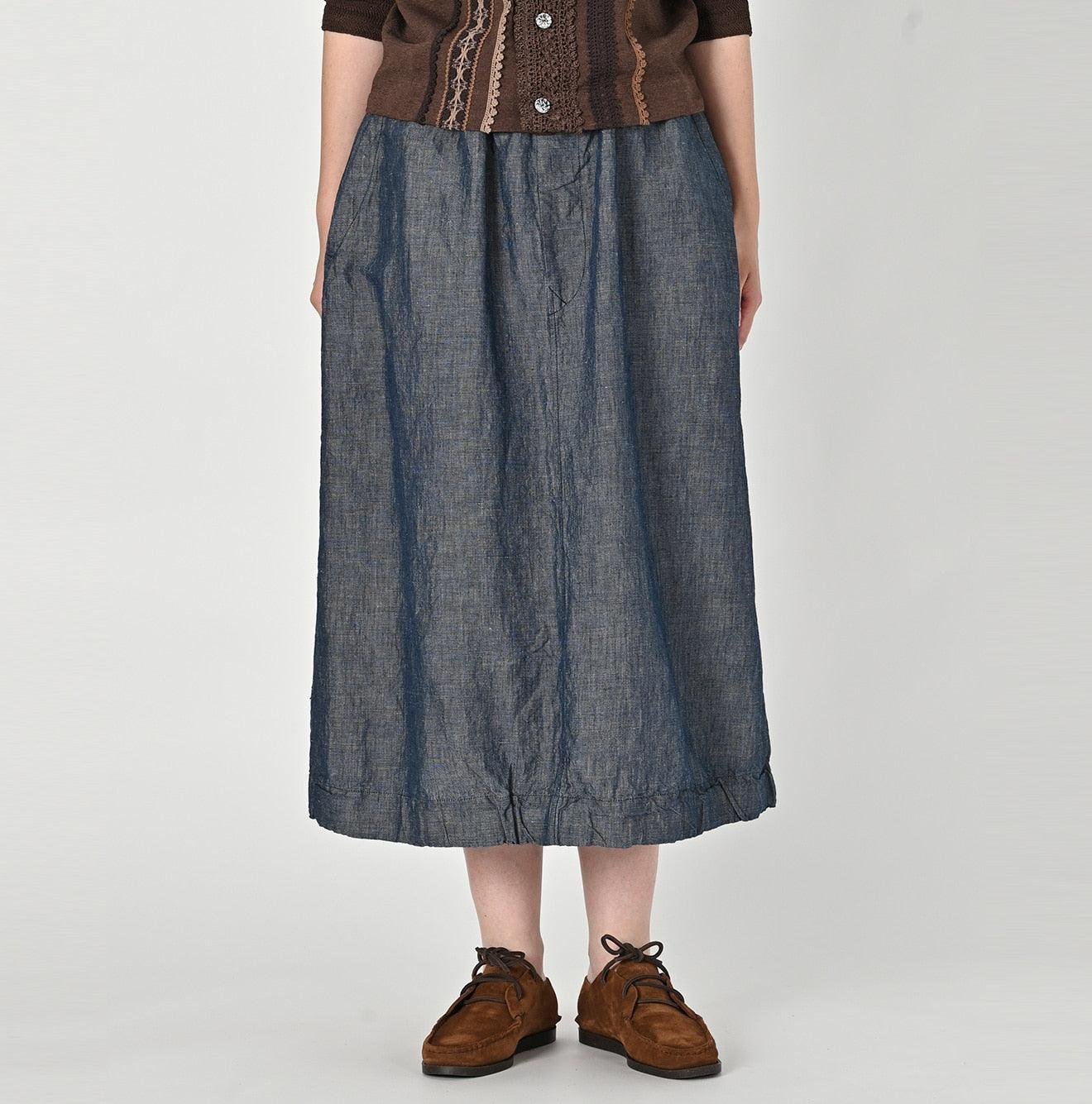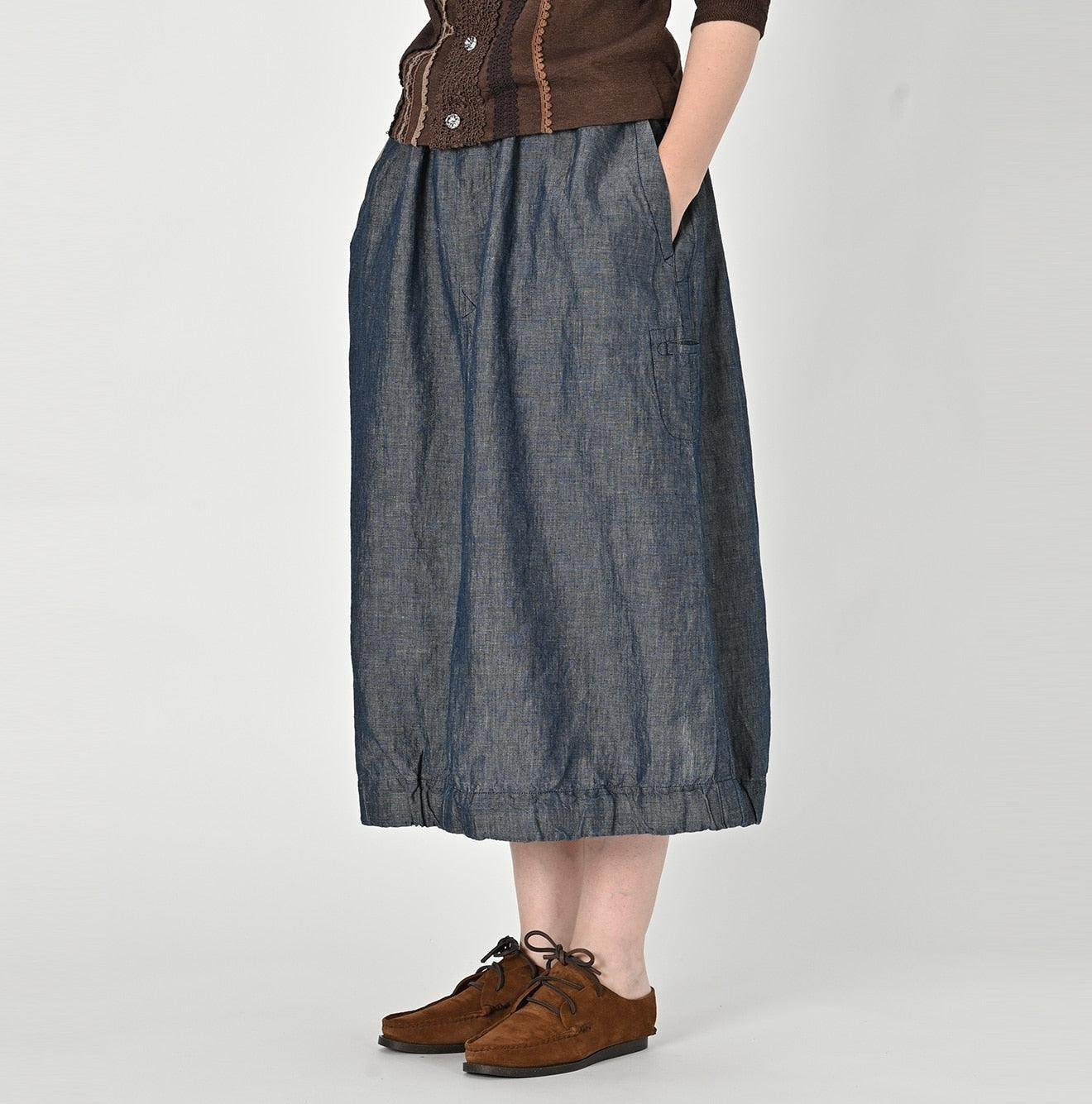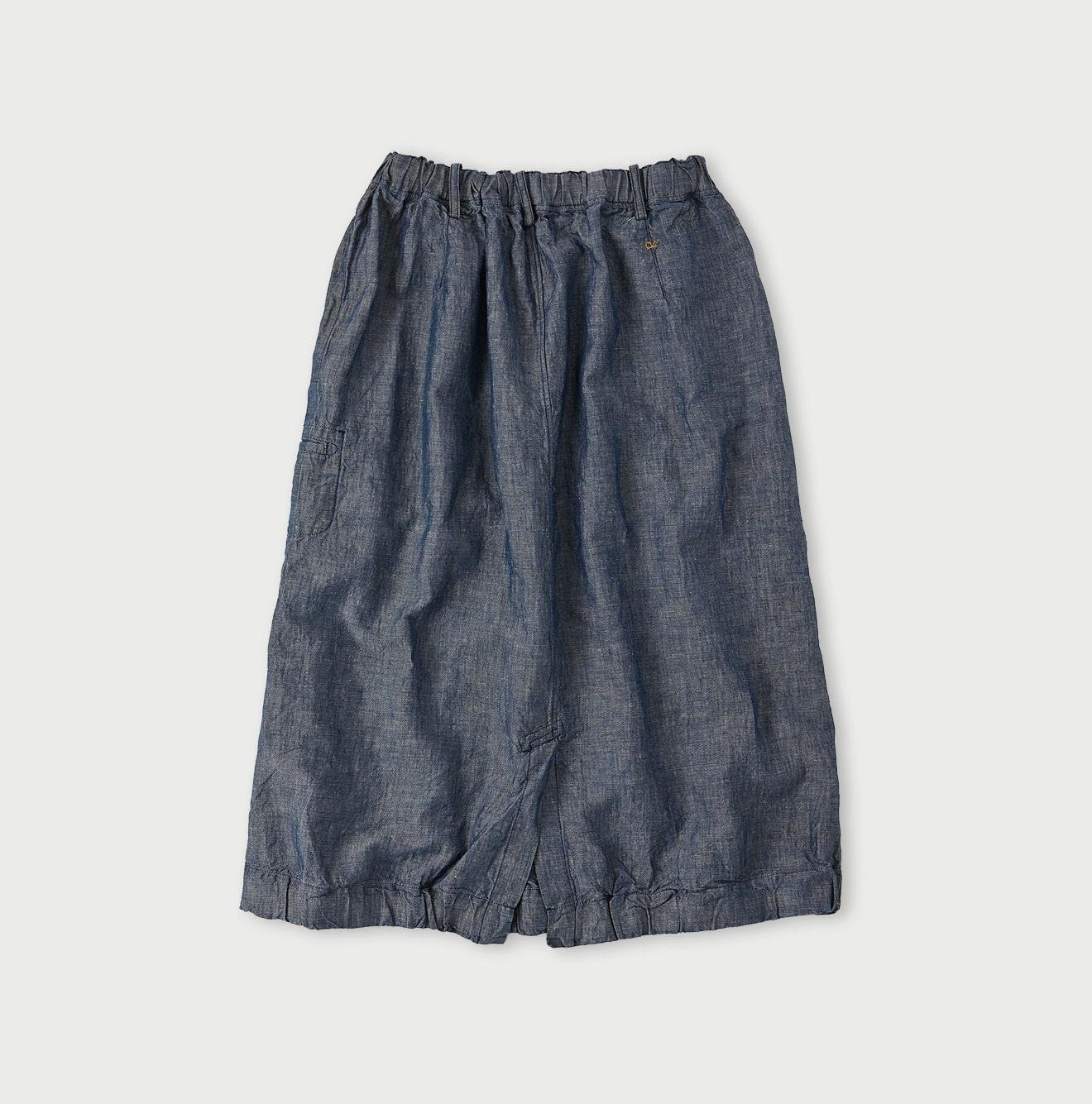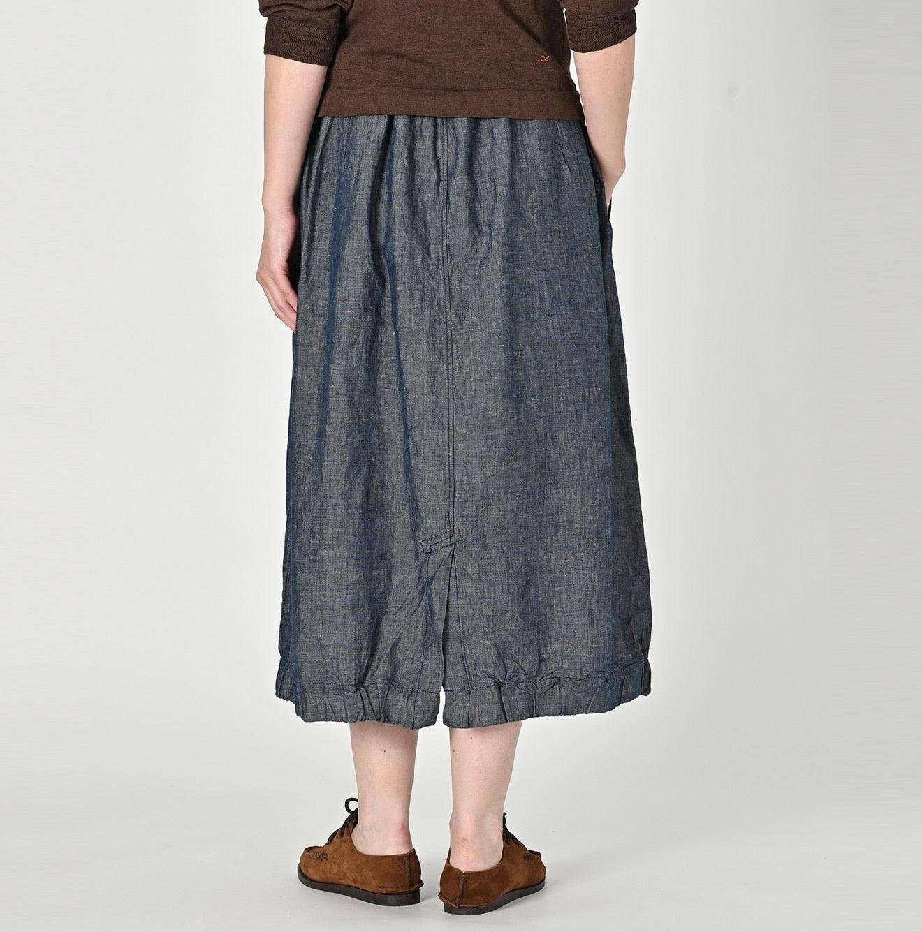 The Cotton Linen Dungaree Chiho Skirt Nou by 45R draws inspiration from the design of military pants. Featuring an elastic waist. this skirt is easy to wear and provides a comfortable fit. The shirring at the hem adds a charming detail to the overall look.