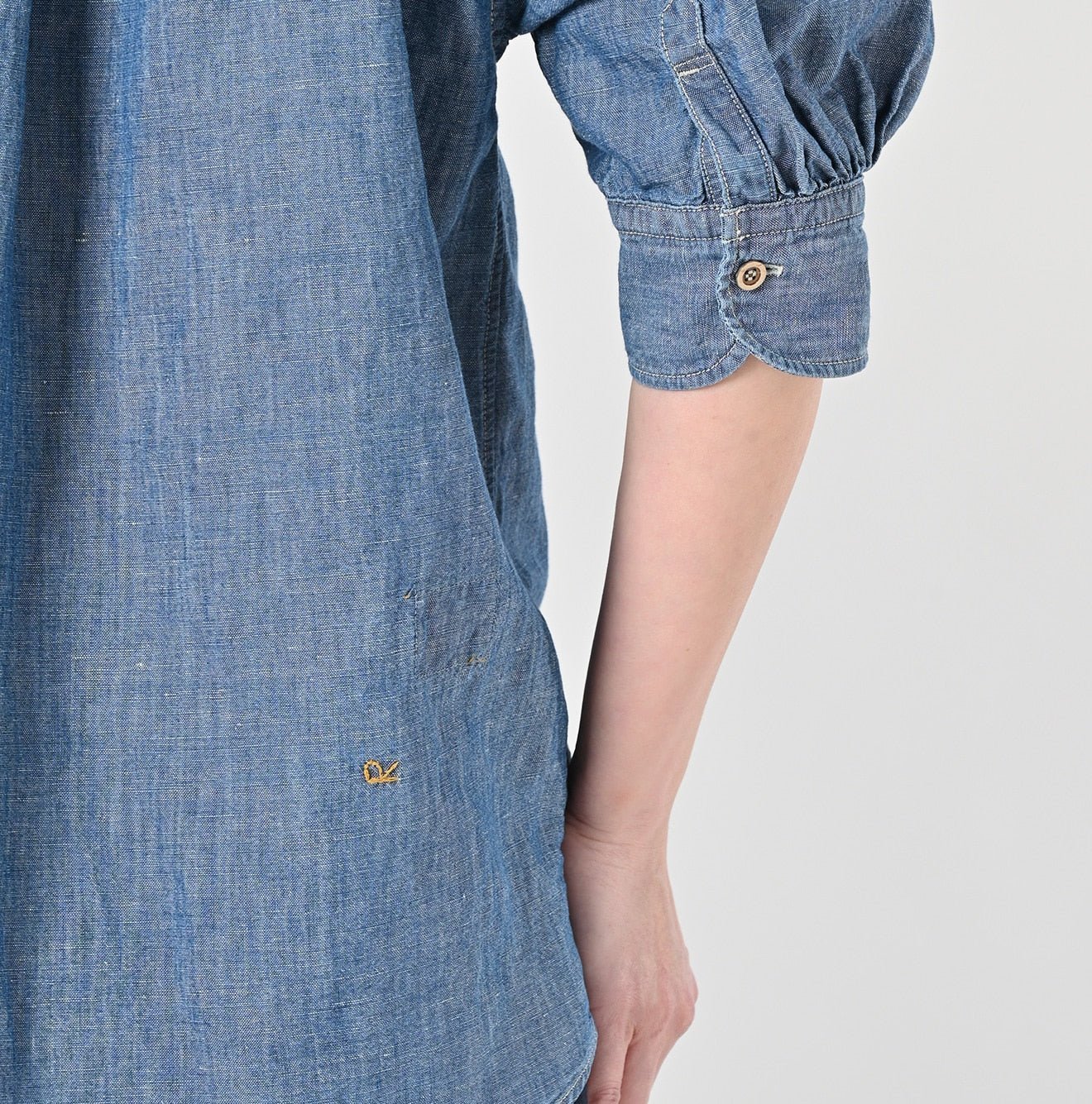 The fabric is a beautifully woven blend of flax-colored linen and indigo blue. creating a lightweight dungaree that feels right at home in a sea breeze. Linen. now considered a rare and precious material. is celebrated here for its texture and quality. Its weave gives the shirt structure and volume. with a dry. textured surface that evokes the feeling of summer against the skin.