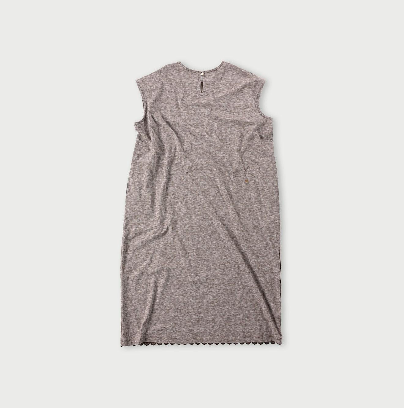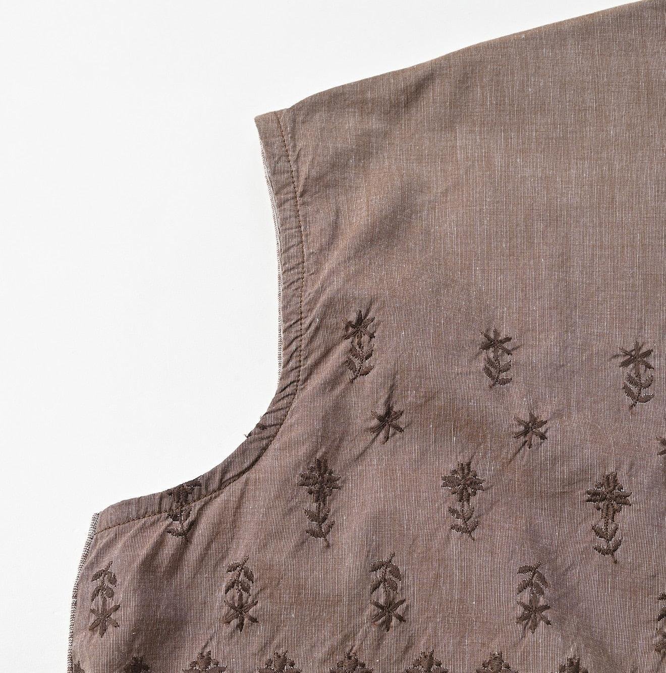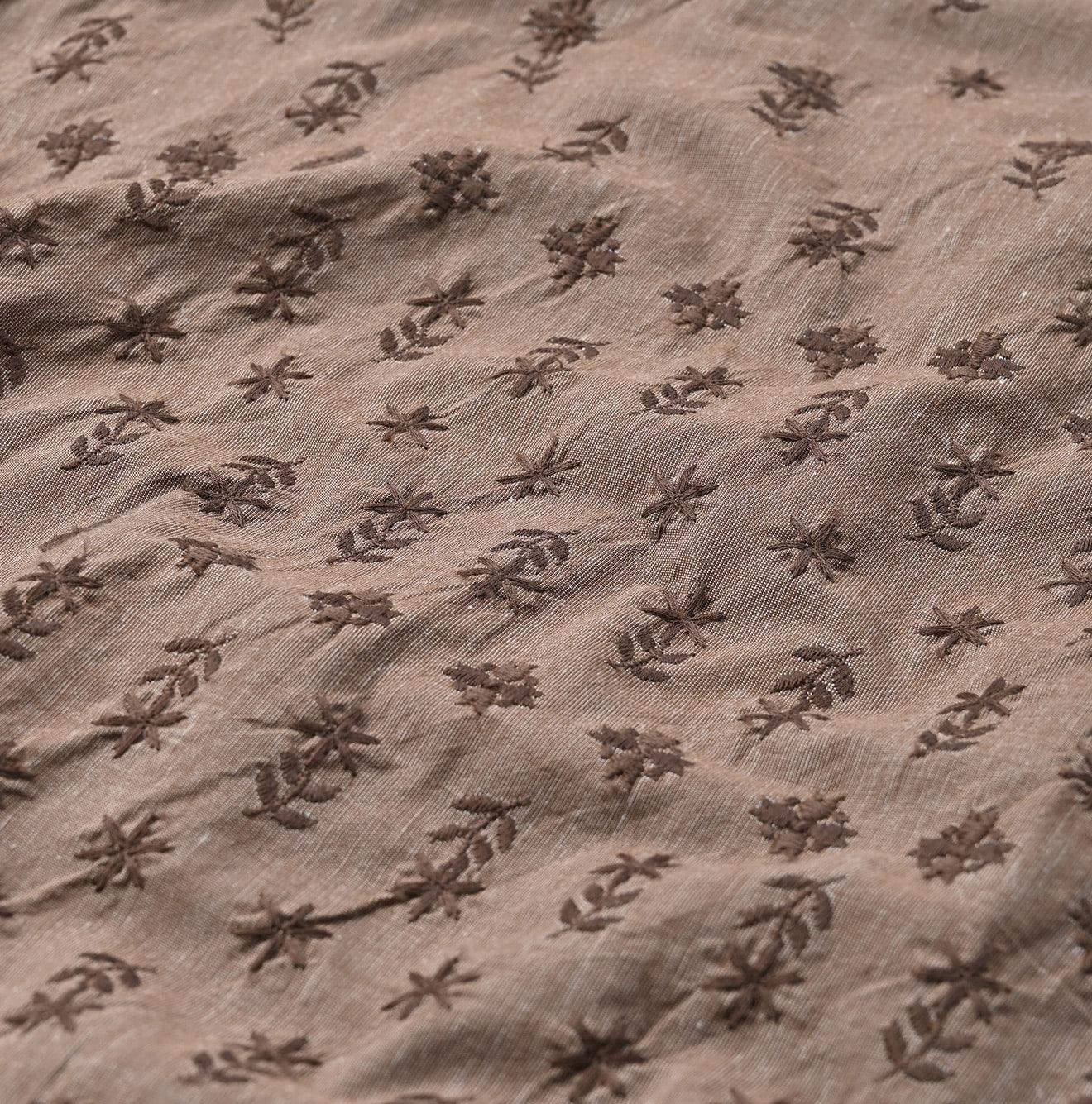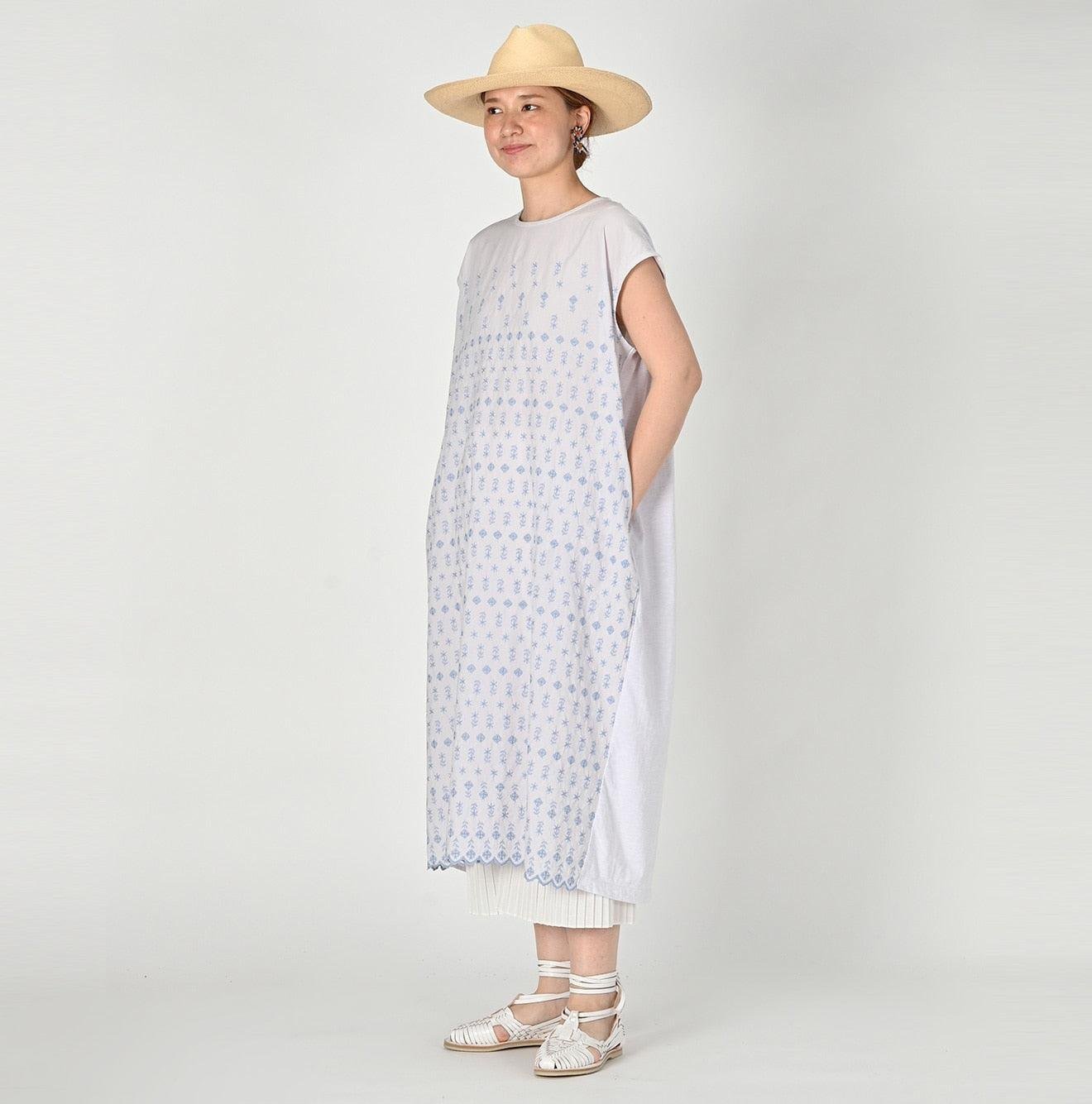 The dress is adorned with lively floral embroidery. which puffs and dips across the fabric. adding texture and charm. The back of the dress features a stretchy ‘Tenjiku’ fabric. adding comfort without sacrificing style. Both materials are cotton-based. providing a soft. plush feel. and the subtle color variance between the front and back adds a delightful touch to this well-balanced dress.